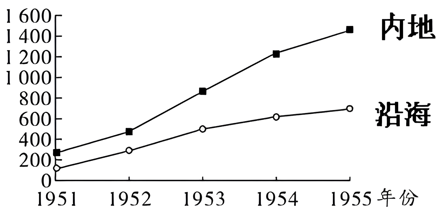 材料二 右图为1951—1955年我国沿海与内地工业增长速度变化示意图