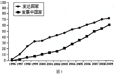材料五 1996—2009年发达国家和发展中国家转基因作物种植面积(单位:百万公顷)