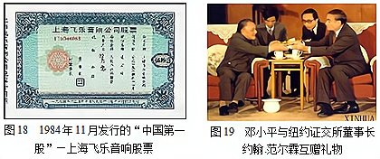 1986年11月14日,邓小平会见了以纽约证券交易所董事长约翰·范尔霖为团长的美国纽约证券交易所代表团,在接受客人赠送给他的纽约证券交易所的证章和证券样后,将一张上海飞乐音响股份有限公司的股票回赠给客人(如图19)。国际社会因此发出了