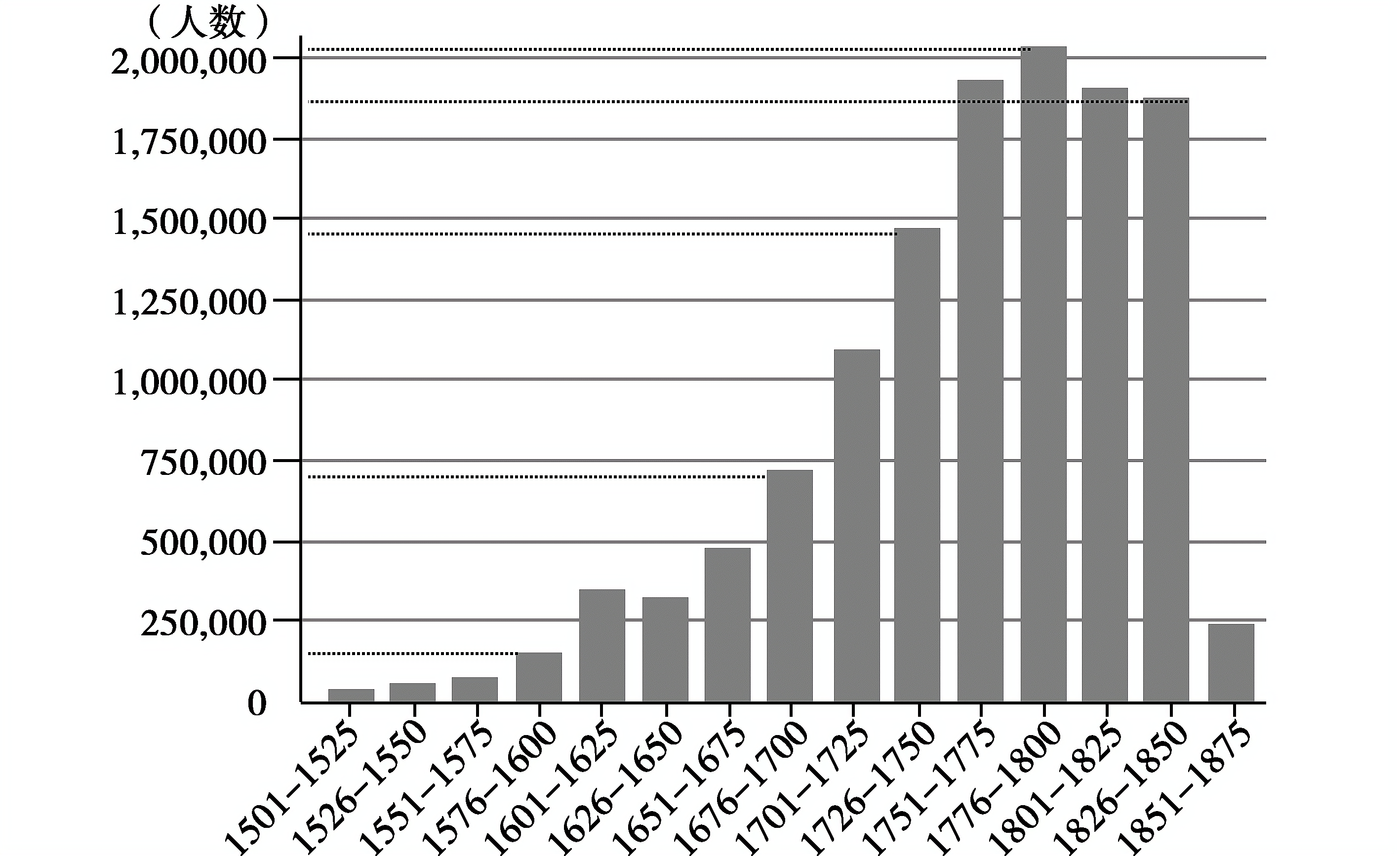 非洲奴隶贸易统计数据柱状图(1501—1875年)