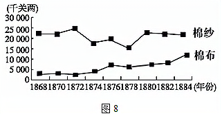 图8是19世纪60至80年代中国进口棉纱、棉布数量变化图。对其解读正确的是( )