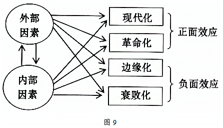罗荣渠在《现代化新论——世界与中国的现代化进程》一书中指出,各种内外因素对近代中国大变革发生作用的过程中,是一个主客体相互作用、复杂的网络运动。如下示意图9: