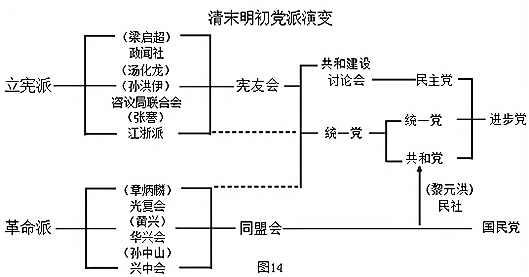 民国政党源流大体可分为两支,其一为革命派,另一为立宪派。革命派以同盟会为正宗,源于兴中会、华兴会和光复会。立宪派在清季为宪友会,亦为政闻社、咨议局联合会和江浙派。民国后,分别演变为国民党和进步党两大集团。具体演变情况如图14: