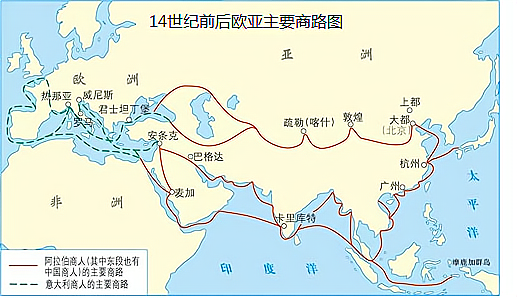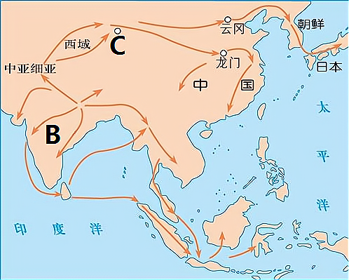 (1)材料一中的商路上,古代中国输出的最具有代表性的商品是什么?它最远可以运到A国,该国是指当时哪个国家?(2分) 材料二 仔细观察《佛教的传播》示意图 (2)结合所学,指出材料二中B处是哪个国家?佛教传播的主要原因是什么?(2分) (3)材料二中C处是世界上最大的艺术宝库之一,它有哪些成就体现了佛教文化的发展?(2分) 材料三 仔细观察《14世纪前后欧亚主要商路》示意图