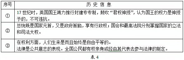 (2)表4中②、③项信息分别出自什么文件?(2分)从①到③项历史信息体现了人类政治文明怎样的发展趋势?(2分) 【观点论证】 (3)有人说罗斯福新政是美国的一场自救运动,也有人说罗斯福新政是资本主义体制的改良运动。请选择其中一种观点结合史实进行论证。(要求:观点明确,史论结合)(4分) |