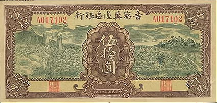 下图为中华民国三十二年晋察冀边区银行印制的货币,该货币量有助于研究并一时期的政治、经济形势?( )