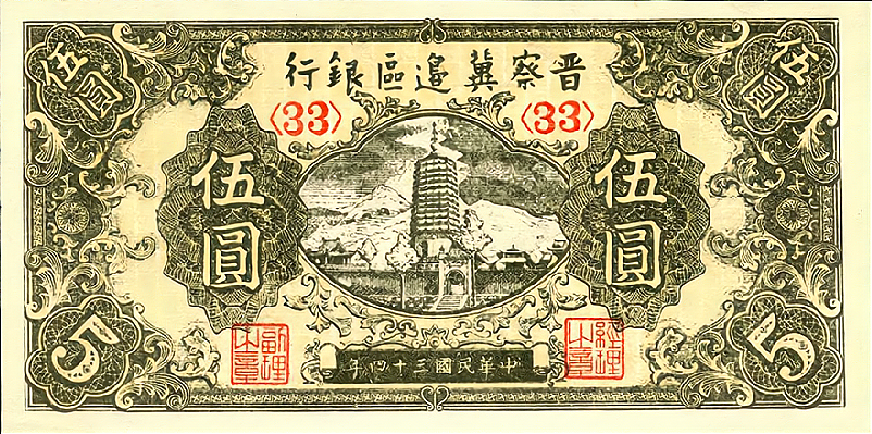 下图为晋察冀边区银行发行的抗日票。这是敌后抗日根据地唯一一家经当时国民政府批准设立的银行,1938年正式成立。