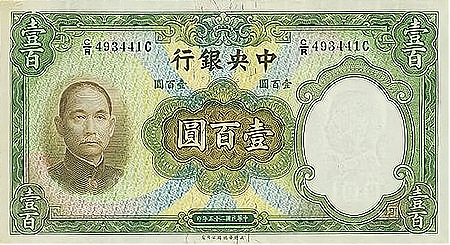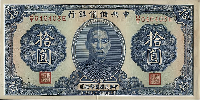 下图为中央储备银行发行的中储券。该银行1941年在南京成立,作为国家银行发行的本位币,可与法币(官方统一货币)相互兑换,在华东,华中和华南地区曾大量流通。