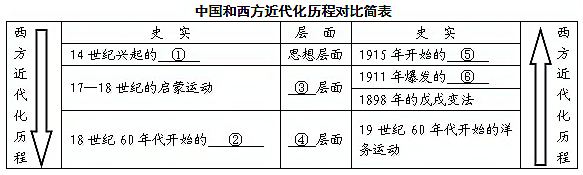 (1)请将表中的①②③④⑤⑥填写完整。(6分) (2)根据上表,指出中国近代化所走过的道路和西方国家有何不同?(3分)中国近代化遭受严重挫折的根本原因是什么?(1分)