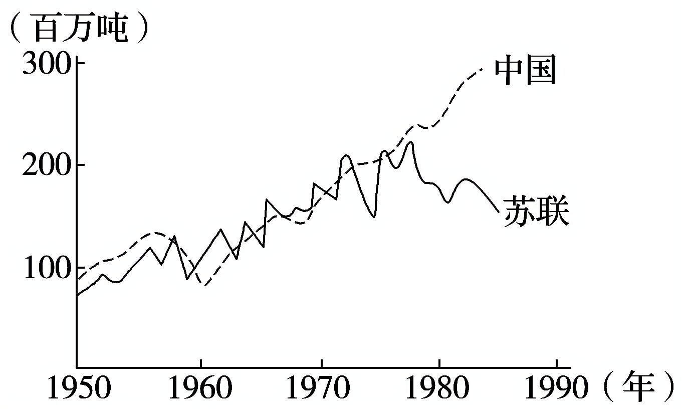 下图是《苏联和中国的粮食产量(1950~1984)示意图》。造成20世纪80年代开始两国粮食产量状况的相同因素主要是( )