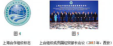 (2)结合材料二图文与所学知识,上海合作组织成立于何时?作为当代国际关系中一次重要的外交实践,上海合作组织提供了一种新型区域合作模式,请指出其特征。(4分)