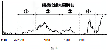 图4为康德拉捷夫世界经济增长与衰退波动周期表,下列对各时期史实叙述正确的是( )