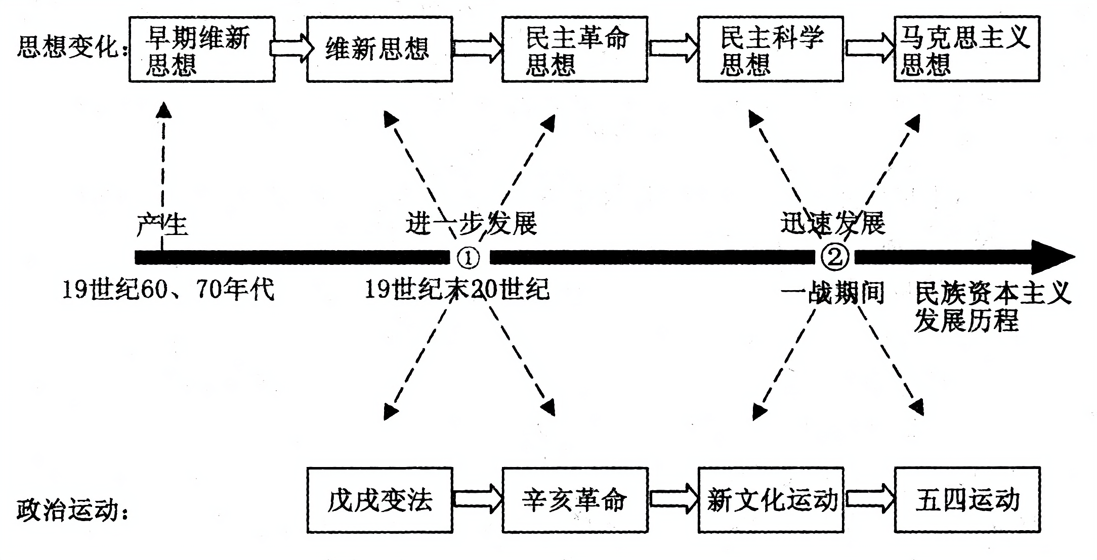 有学者在研究中国近代民族资本主义发展历程及作用时,设计了如下示意图。