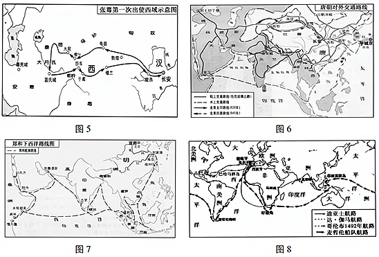 材料二 “一带一路”(即丝绸之路经济带和21世纪海上丝绸之路)的倡议源自中国,但属于世界。它依托历史,弘扬丝路精神,顺应世界潮流,为中国改革开放的推进提供了新的契机,也为世界联动发展注入澎湃活力。 (1)张骞通西域奠定了古丝绸之路的基础,中国古丝绸之路开始开辟于哪个朝代?( 2分)丝绸之路开通后,中国传入西方的技术有哪些?(4分) (2)唐朝时在广州设置了我国历史上最早管理对外贸易的官署是什么?(2分)郑和下西洋的目的是什么?(2分) (3)新航路开辟的根本原因是什么?(2分)新航路开辟后,最早走上殖民扩张道路的是哪两个西方围家?(2分) (4)根据本题的前提语、示图和材料,概括古丝绸之路的开辟和发展过程中所体现出的“丝路精神”。(4分) |