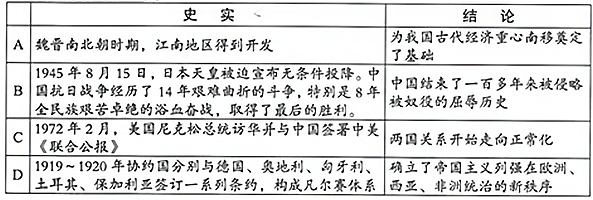 (1)上表A~D四项中,史实与结论之间逻辑关系不正确的一项是______。(1分) (2)理由分析(只分析你所选之项)