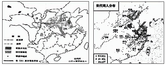 比较《唐代诗人分布》和《宋代词人分布》图,提取唐代诗人分布与宋代词人分布差异的信息,并结合所学知识分析原因。