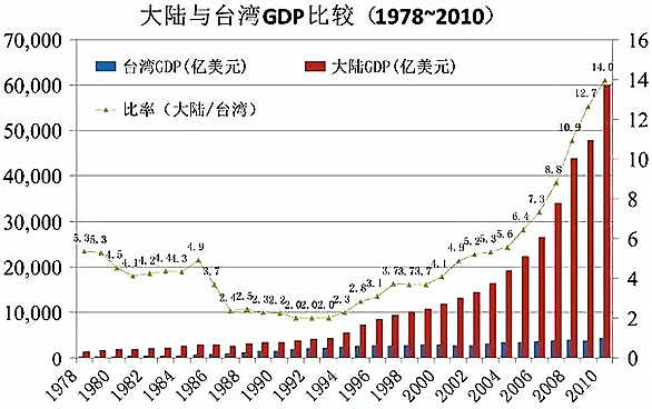 下图是上世纪1978年以来大陆与台湾GDP比较示意图,观察数据,下列结论符合史实的是( )