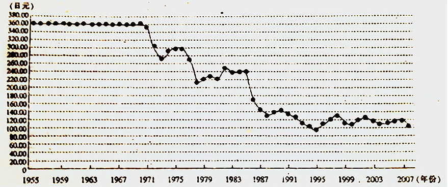 下图反映了1955~2007年1美兑换日元的数量变化,对此图解读正确的是( )