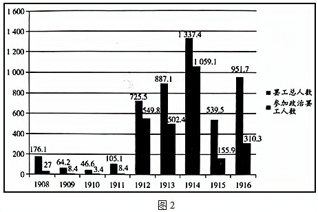 图2为1908—1916年俄国的罢工人数统计图(单位:千人)图2反映了俄国( )