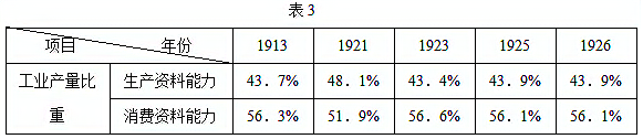 表3是俄国(苏联)1913 年—1926 年工业生产情况,以下有关这一时期工业发展的结论,符合表中信息的是( )