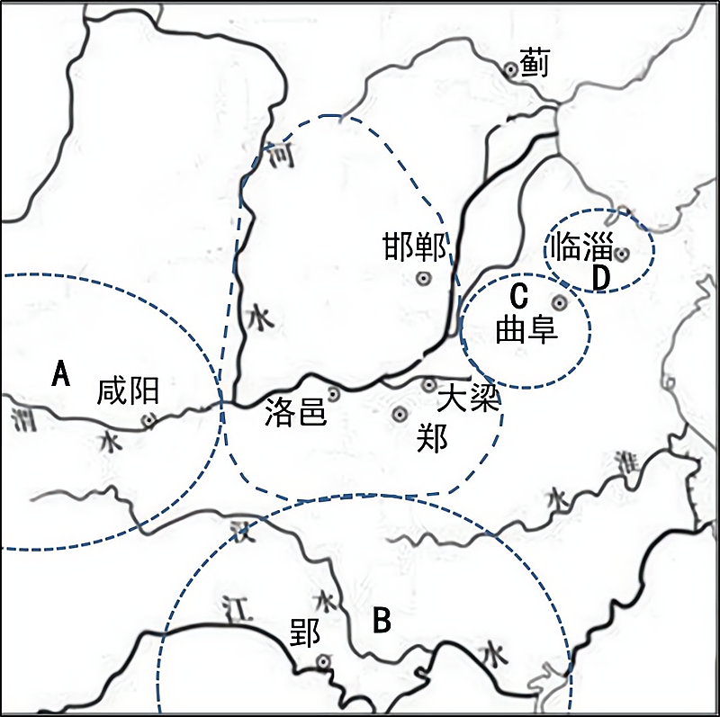 战国时期思想的起源和流行具有地域特征。图1是战国思想大致分域图(虚线为分界线),下列主张与代号对应正确的是( )
