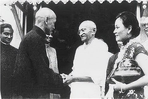 1942年2月,蒋介石访问印度,与印度政治领袖甘地会谈(下图中间穿白者),试图奉劝这位政治领袖放弃反对战争的立场。甘地一方面表达了对中国抗战的祝福,另一方面拒绝了蒋介石的主张。下列关于该历史事件的解读,正确的是( )