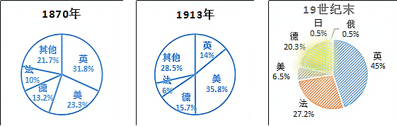 下图是英国、法国、德国、美国在1870—1913年世界工业生产中的比重变化示意图和19世纪末主要资本主义国家对外资本输出比例示意图。据此可知( )