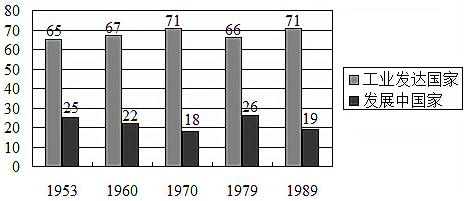 下列柱状图反映了1953—1989年战后发达国家与发展中国家在世界贸易中的比重(%)综合图7可知,这一时期( )