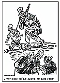 图7是美国20世纪五十年代的一幅漫画。漫画中蒋介石用链条锁住了山姆大叔先生的鼻子。他们脚下是金门、马祖岛。美国总统艾森豪威尔、国务卿杜勒斯在向一位记者解释。该漫画意在( )