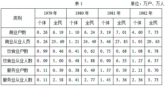 表1为1979—1982年湖南省零售商业、饮食业、服务业户数和从业人数,可知当时中国( )