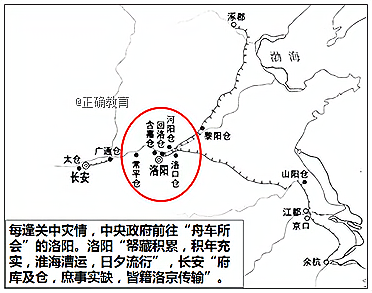 隋唐时期,以洛阳为中心,建起众多皇家粮仓(见下图),其中含嘉仓至唐天宝八年总储粮量约为5833400石,被称为中国古代最大的粮仓。这反映了( )