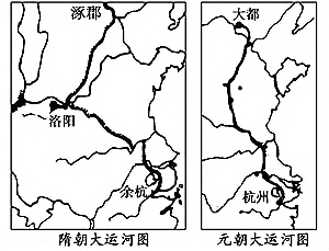 下图为“隋朝大运河和元朝大运河比较”图。大运河河道的变迁是( )