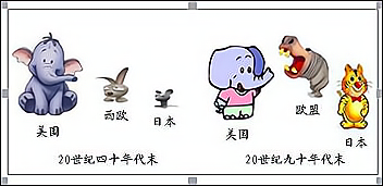 右边漫画表现了二战后美、日、欧经济实力的对比变化。对这一漫画的解读,表述准确的是( )