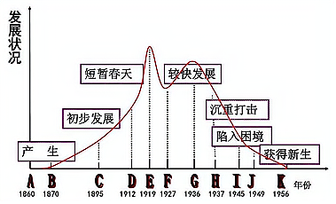 我国近代民族资本生义在发展道路上既存在许多控折,又有不少机遇。有人用下图来表示民族资本主义的发展。