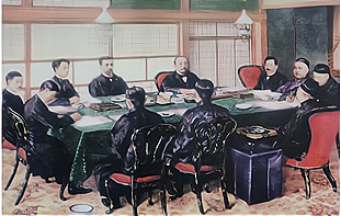 注:正面坐者右起为日本首相伊藤博文、陆奥宗光、伊东已代治,其对面右起为李鸿章(身侧是他的专用痰盂)、李经方、马建忠,右边为罗丰禄和伍廷芳,左内为外相秘书田中。