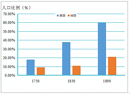 右面是1750年~1890年间,英法两国一万人以上的城市人口比例的对比变化示意图。此示意图中的对比差异说明( )