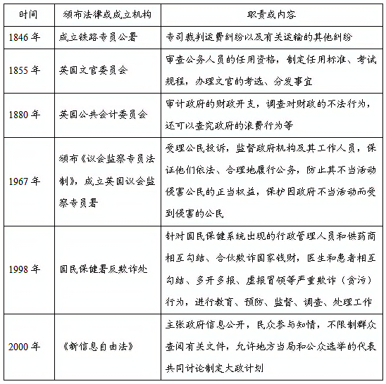 ——摘编自张恒《英国监察制度:在漫长曲折的道路上逐步形成》(《中国监察》2004年第15期)