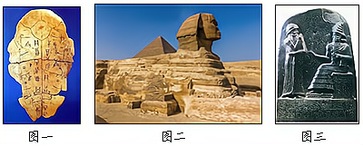 (1)三幅图共同反映了人类历史经历的哪一社会时期?所代表的地区文明有哪些相似之处? (2)图一和图三的文物上有两种古老的文字,这两种古老的文字分别是什么? (3)任选一幅图,说说图片反映的内容在历史上的价值。