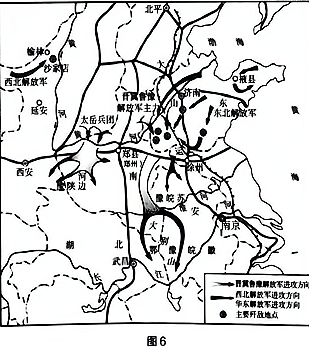 图6反映的是解放战争时期人民解放军同国民党军队的军事斗争形势。以下描述与之相符的是( )