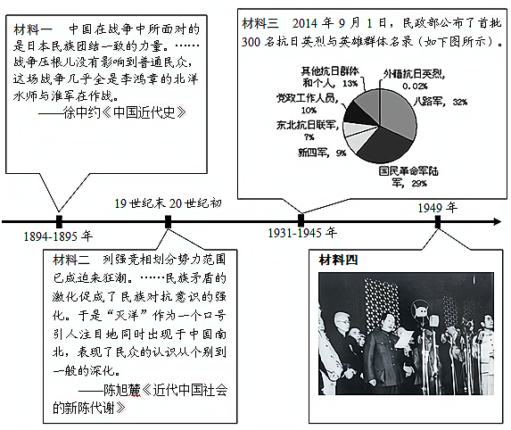 (1)结合所学知识,写出材料一中的“战争”名称及“北洋水师”全军覆没的地点,分析此次战争后签订的条约与材料二“迫来狂潮”之间的关系。(3分) (2)结合所学知识,材料二中“灭洋”这一口号在哪一事件中表现最为突出?据材料二,列举“民族对抗意识的强化”的具体表现。(3分) (3)据材料三,指出中国共产党领导的军队在“抗日英烈与英雄群体名录”中所占的比重,该数据反映出抗战胜利的重要原因是什么?(2分) (4)材料四反映的是哪一重大历史事件?该事件表明中国建成什么性质的国家?(2分) (5)综上所述,归纳近代中国能够完成民族民主革命的条件。(2分) |