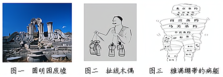 (1)上面三幅图片见证或刻画了近代中国的屈辱历程。图一中的“废墟”是哪次侵华战争造成的?哪一条约的签订表明清政府成为西方列强的“扯线木偶”?图三“缠满绷带的病躯”所反映的信息,表明当时中国社会性质最终发生了怎样的变化? (3分) 材料二 (大清宣统五年正月初三)自变乱以来,一切新党竞袭洋夷之皮毛,不但遵行外洋之政治,改阴历为阳历,即服色亦效洋式,而外洋各国蚕食鲸吞,日甚一日。来拜年者五十余人,皆系便衣便帽,无一顶戴之人,间有洋帽之人,较上年之情形迥然不同。