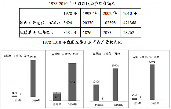 (4)观察上表,1978年和1992年中共两次重大会议的召开促进了新时期国民经济的快速增长。请说出这两次会议的名称以及在经济方面分别做出了哪些重大决定?这一时期中国走的是适合中国国情的什么道路?(5分) 材料五 不忘初心,方得始终。中国共产党人的初心和使命,就是为中国人民谋幸福,为中华民族谋复兴。这个初心和使命是激励中国共产党人不断前进的根本动力。