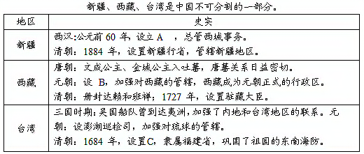 (1)请写出材料一表格中 A.B.C 处应填入的合适内容。(3分) (2)材料二中“中国人民的抗日战争,在一九三一年就开始了”是指哪一历史事件?中国抗日战争取得胜利的根本原因是什么?(2分) (3)材料三中的两幅图是20世纪末回归祖国的两个地区的区旗。这两个地区的顺利回归得益于哪一方针政策的成功实施?今年是澳门回归多少周年?(2分) |