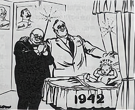 下图漫画中,罗斯福和丘吉尔手中各拿着一根魔术棒,在庆祝一个 1942 年诞生的被称为“联合”的新生儿。这个 “新生儿”是( )