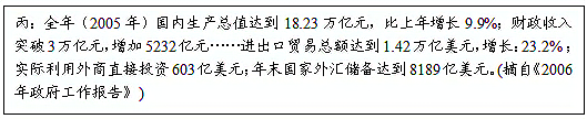 (3)改革开放使我国进入现代化建设新时期。据材料丙归纳2005年我国的经济特征,分析这一经济特征出现的主要原因。(4分)