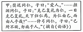 (1)研读经典是走进传统文化的第步。概括右侧材料甲中“仁”的含义,孔子倡导“仁”是为了解决当时的什么问题? (4分) (2)体验情怀是学习传统文化的主要方式。概括材料乙中唐太宗的执政理念。结合所学知识,指出他践行这一执政理念的具体措施。(4分)