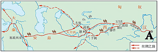 (1)图一A处是当时的哪一个城市?(2分) (2)西汉时期,汉武帝派谁两次出使西域?丝绸之路的形成有什么历史意义?(3分)