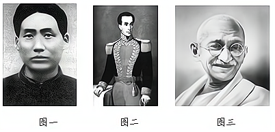 (1)图一的人物是___________ (1分),八七会议后,他回到湖南领导________起义(1分)。 (2)图二的人物是___________ (1分),他和圣马丁被誉为南美的“____________”(1分)。 (3)图三的人物是甘地,他领导的是_______________运动(1分)。