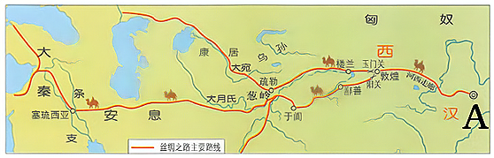 材料二 唐朝时期,他前往天竺,求取真经。归来后,根据他的口述,由弟子记录成书,这部书是研究中外交流史的珍贵文献。 (1)写出材料中A点的名称。对开通这条道路贡献最大的是哪位历史人物?(2分) (2)写出材料二中“珍贵文献”的名称。(1分) (3)请谈谈古代中外经济文化交流给你的启示。(1分)