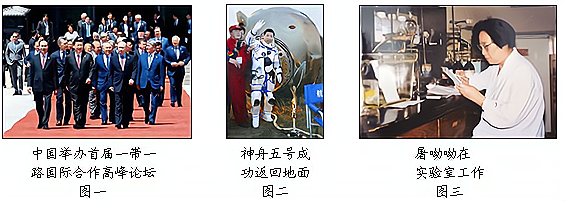 图一表明中国在国际事务中发挥越来越重要的作用.写出新中国成立以来我国奉行的外交政策。(1分)中国紧跟第三次科技革命,科技飞速发展。图二中的航天员是 (1分)图三是发现 的屠呦呦,她在2015年获得诺贝尔生理学或医学奖。(1分) 探究四【民族复兴】(2分) (1)为了实现民族复兴,中国共产党在十九大上确立的党的指导思想是什么?(1分) (2)通过以上的探究,你获得了什么感悟?(1分) |